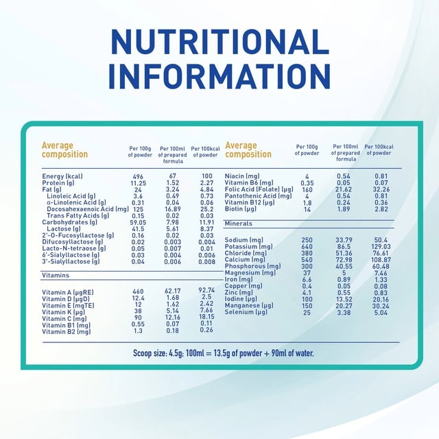 Ingredients: Skimmed Cow’s MILK, Non-hydrogenated Vegetable Oils,Whey Permeate (from Cow’s MILK), LACTOSE, Demineralized Whey (from Cow’s MILK), Emulsifier (SOY Lecithin), Docosahexaenoic Acid (from Schizochytrium species Oil), 2′-Fucosyllactose,Lacto-N-Tetraose, 6′-Sialyllactose, Difucossyllactose, 3′-Sialyllactose, Antioxidants (Mixed Tocopherol Concentrate, L-Ascorbyl Palmitate), Acidity Regulator(Citric Acid), Bifidobacterium lactis. Vitamins: Vitamin C, Vitamin E, Niacin, Pantothenic Acid, Vitamin B1, Vitamin A, Vitamin B6, Vitamin B2, Folic Acid, Vitamin K, Vitamin D, Biotin, Vitamin B12. Minerals: Calcium Citrate, Sodium Citrate, Potassium Chloride, Potassium citrate, Sodium Phosphate, Ferrous Sulfate, Magnesium Chloride, Zinc Sulfate, Copper Sulfate, Manganese Sulfate, Potassium Iodide, Sodium Selenate. Contains MILK (Including LACTOSE) & SOY.